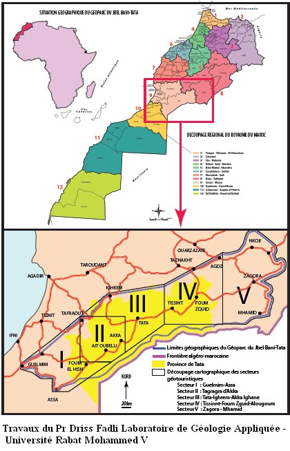 Situation géographique du Géoparc Jbel Bani avec découpage secteurs de recherches et d’études